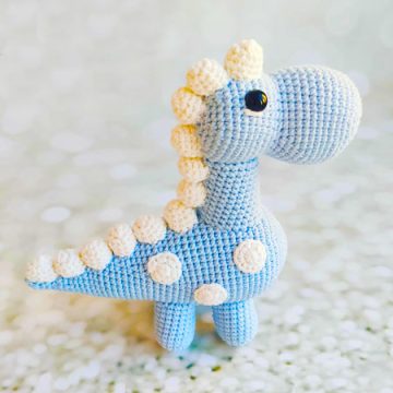 Wat dacht je van een dinosaurus met witte vlekken en stekels op zijn rug? Dit dinosaurusamigurumi-speelgoed heeft een zeer grote neus en voeten met een zeer eenvoudig ontwerp. Er zijn drie witte vlekken op het lichaam van het amigurumi-speelgoed, en